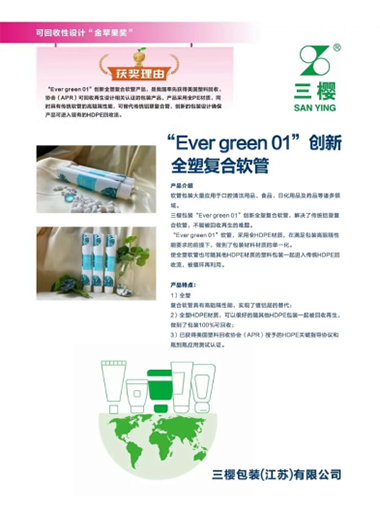 三樱包装(江苏)有限公司(获奖产品:三樱包装“Ever green 01”创新全塑(HDPE)复合软管)