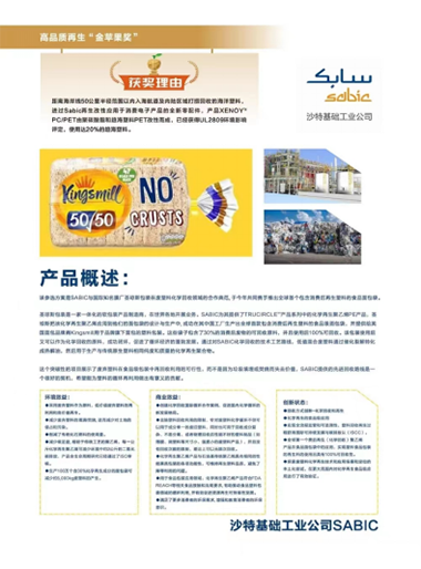 沙特基础工业公司(获奖产品:高品质再生聚乙烯在食品面包袋中的全球首次应用-SABIC TRUCIRCLETM化学循环解决方案)