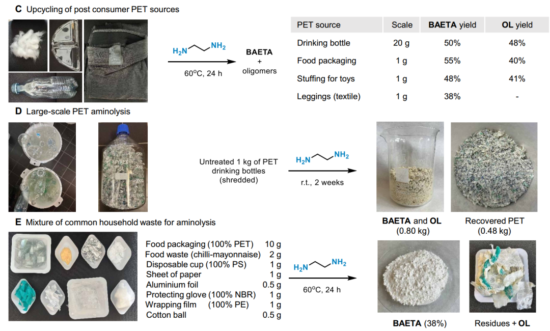 研究进一步测试了不同类型的PET废料,包括食品包装、玩具填充物、纺织品等。并进行了1公斤级别的大规模反应,产出800克BAETA与OLs混合物,验证了工艺的可扩展性。