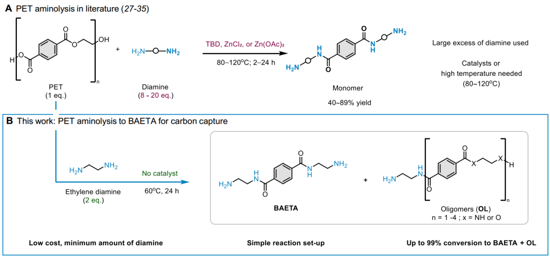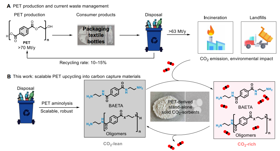 图1. 重新利用PET塑料废物来捕获二氧化碳。(A)PET生命周期和项目动机。(B)将PET升级循环为可扩展的碳捕获材料的替代废物缓解[X=N(H)或O]