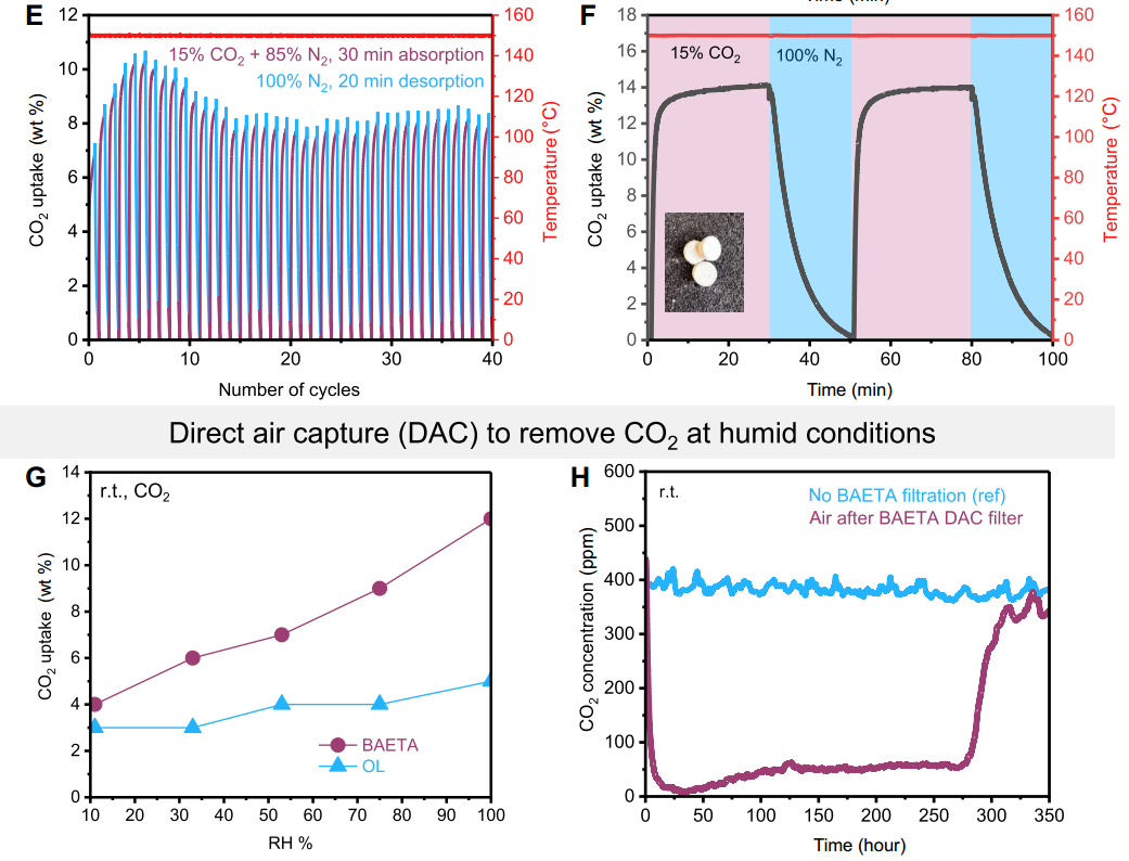 材料性能优异:BAETA展现出极高的热稳定性、耐氧化性和反复使用能力,显著优于传统液体胺和部分商业固体吸附剂。