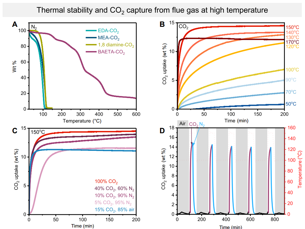 在100% CO₂流中,BAETA在150°C时吸附能力达15 wt%(3.4 mol/kg)
