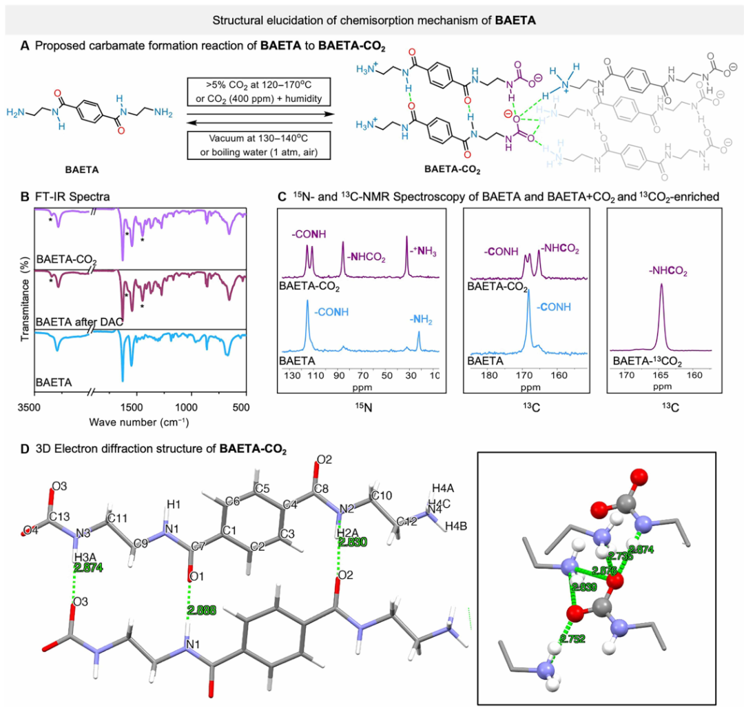 图4. BAETA在CO2吸收过程中的结构变化。(A)BAETA在CO2捕获条件下的氨基甲酸酯形成反应。(B)BAETA的FTIR光谱:DAC后(勃艮第),在150°C下热CO2捕获后(紫色),和贫BAETA(蓝色)。(C)固态15 N和13 C(仅羰基区域)使用1H 15 N CP(左)、1H 13 C CP(中)和具有13 C标记的CO2的1H 13 C CP(右)的BAETA(蓝色)和BAETA-CO2(品红色)的CP/MAS NMR谱;补充材料第4.3节中的全光谱。(D)通过ED获得的BAETA-CO2的结构。氮原子和氧原子之间的绿色线表示氢键(N-H···O)的距离,测量值在2.7和2.9Å之间。