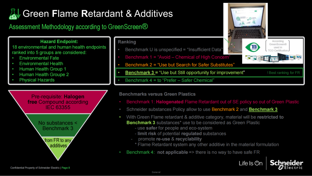 绿色阻燃与添加剂:通过 GreenScreen® 评估体系,达到Benchmark3级或以上,确保材料安全性与环境友好性,推动材料的可回收与再利用。