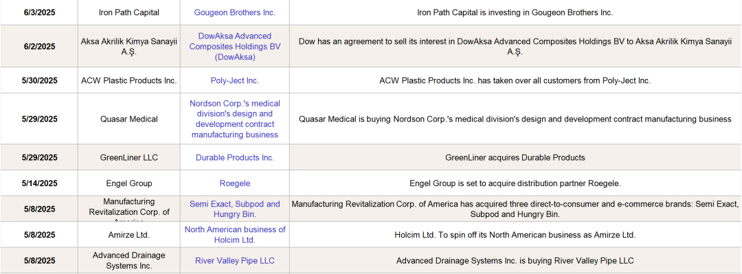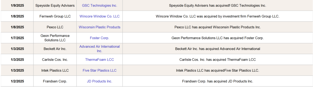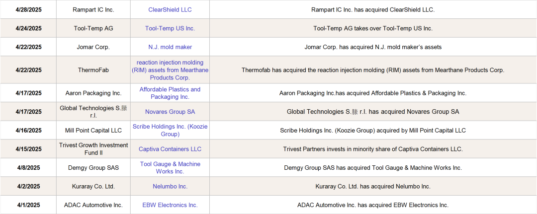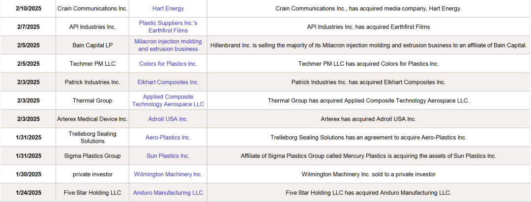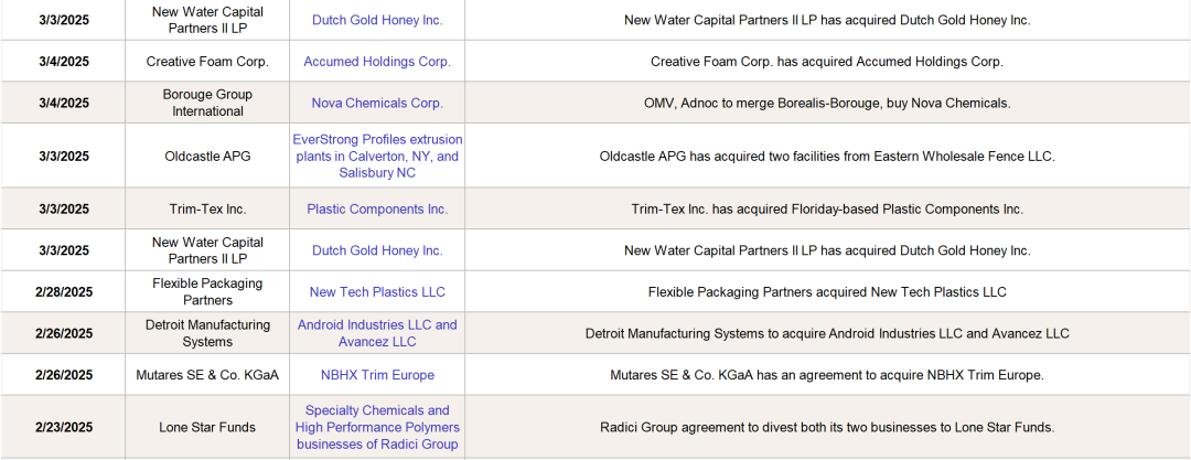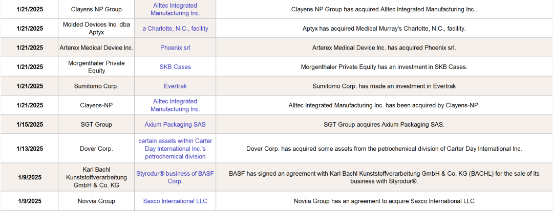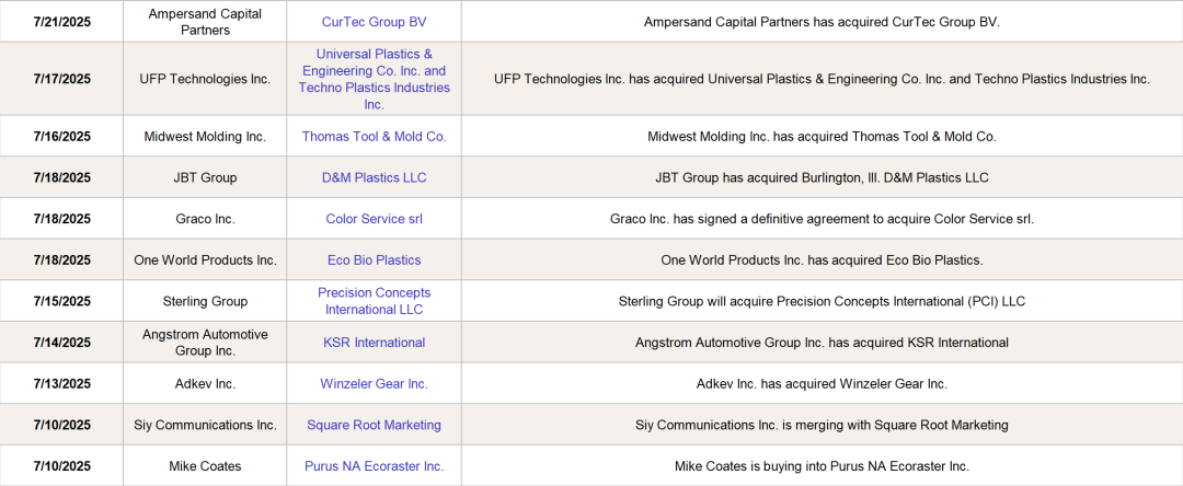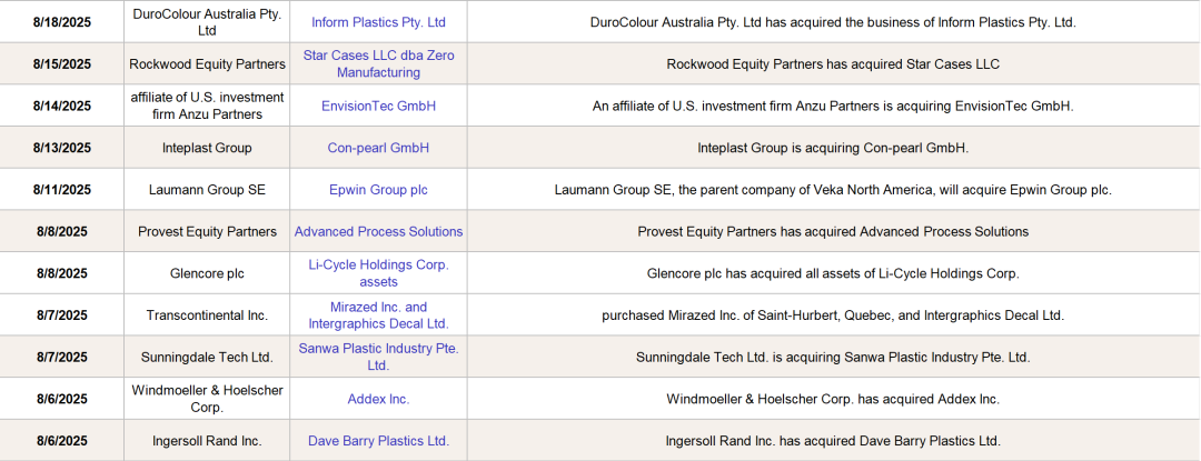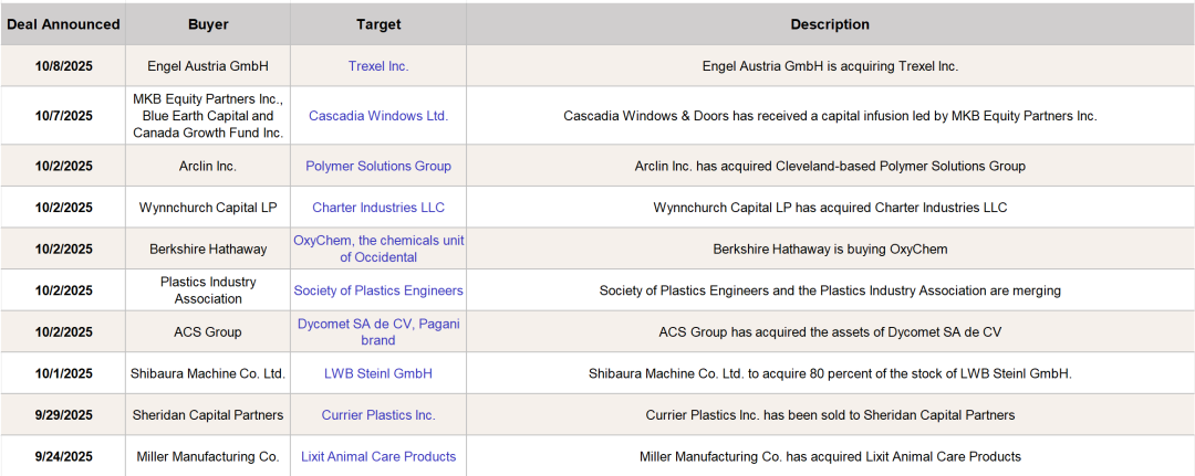 本文基于 Plastics News 的“并购追踪清单”摘要信息(由其编辑团队汇编)进行行业向的中立解读。清单条目包含“买方—标的—阅读链接”等基础字段;如需核对具体交易金额、交割进度或技术细节,建议读者据链接逐一查阅原报道与公告。