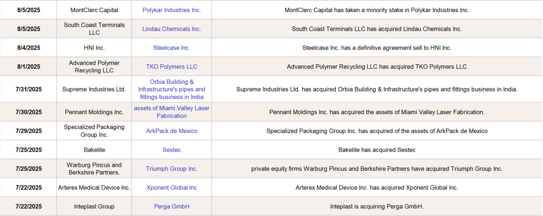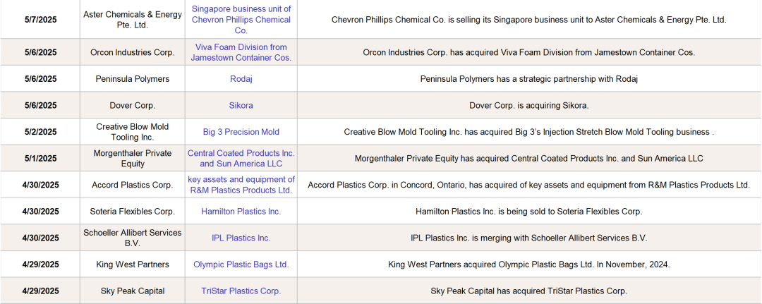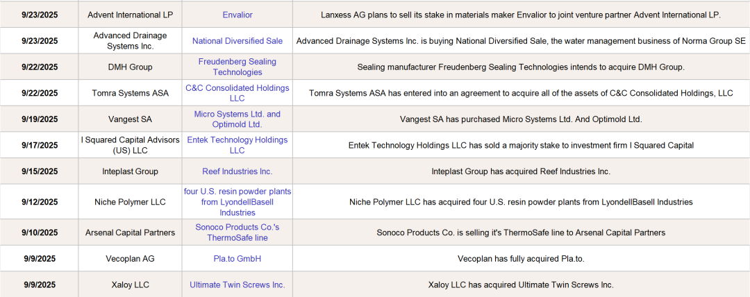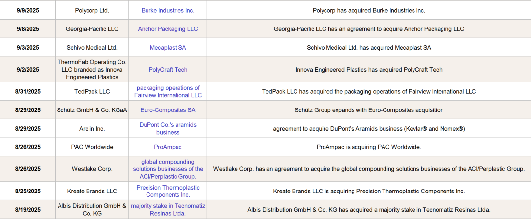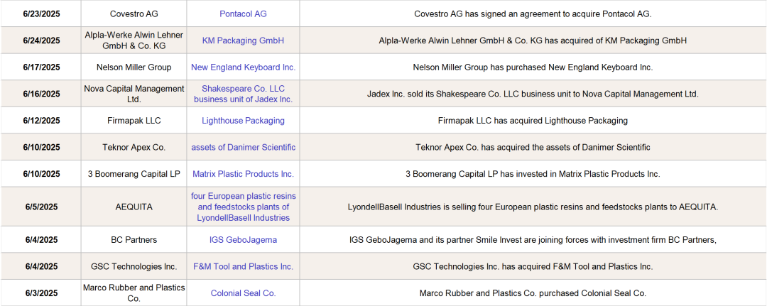 这份并购清单意味着什么?首先是并购活动持续发生在塑料价值链的多环节:从回收/分选、清洗再生、PCR(再生料)配混,到包装与改性加工、上游树脂与化工。其次是买方类型呈多元化:产业内生扩张(材料商、包装转化商)、环境与废弃物管理企业、以及财务投资者均有出现。