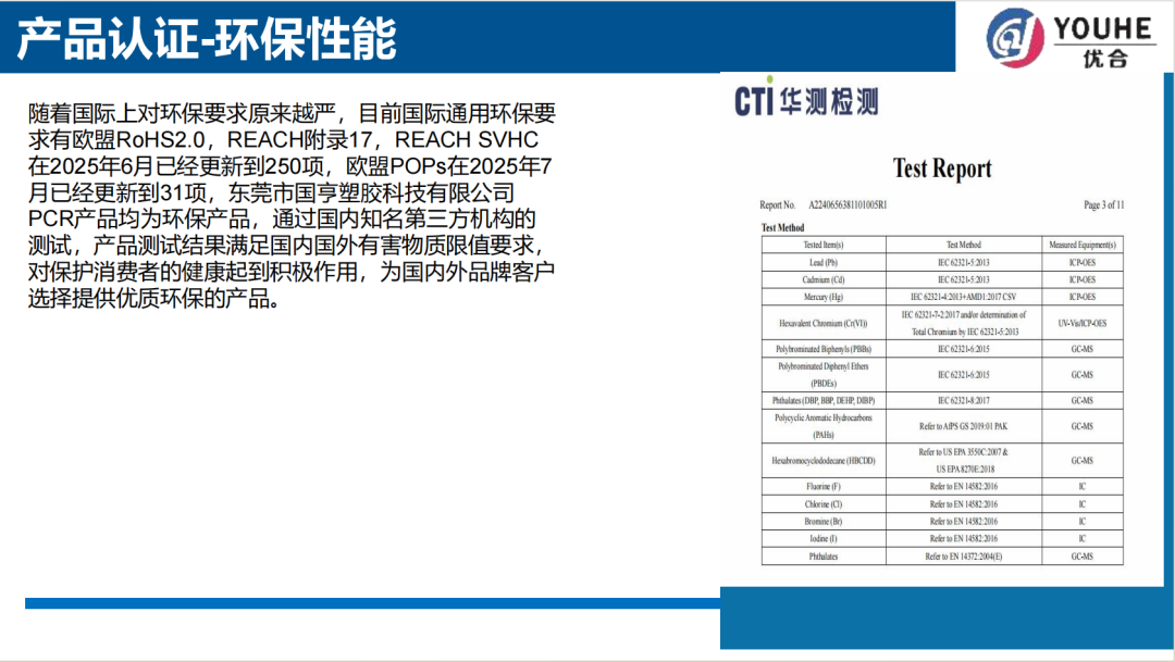 全线产品通过 RoHS2.0、REACH、POPs 等国际环保标准检测;