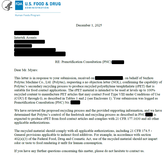 2025年12月1日,Intertek ASSURIS全球法规专家服务部收到美国食品药品监督管理局(Food and Drug Administration,FDA)的回函,确认张家港宝塑机械有限公司(Suzhou Polytec Machine Co., LTD,以下简称 “宝塑机械”)成功获得FDA批准发布的无异议函(Non-Objection Letter, NOL)。