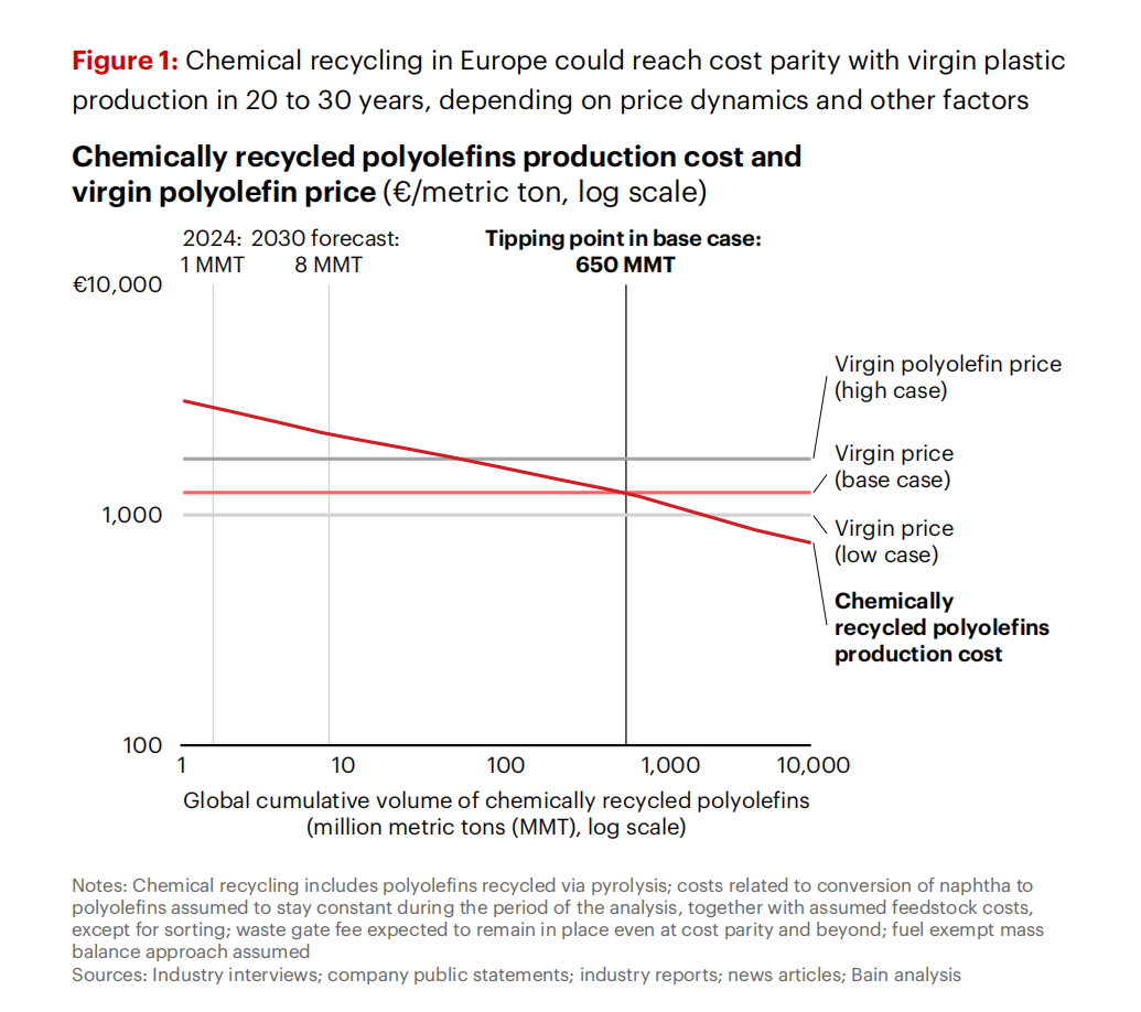 报告的核心分析指出,化学回收无法单靠市场力量实现与原生塑料的成本持平,因为初始规模有限,难以产生显著的成本效益。这是一个政策驱动的市场。