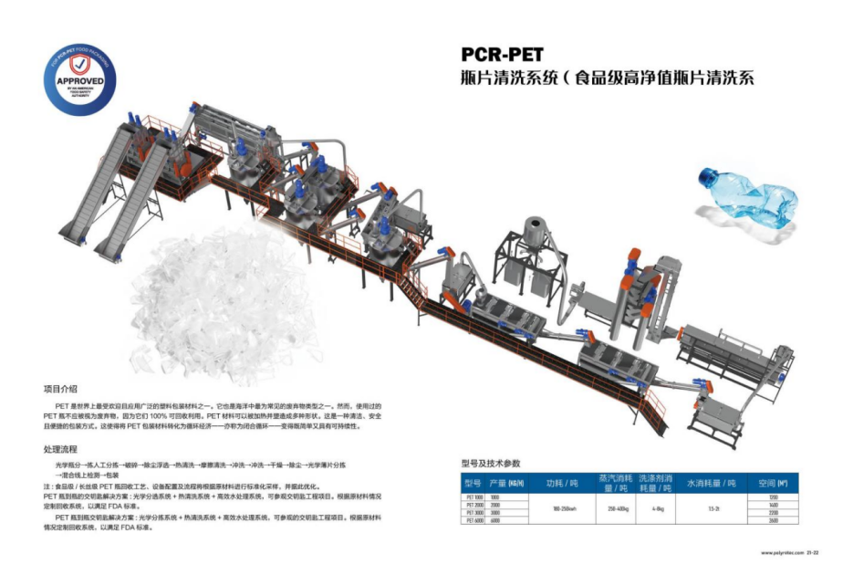 PET塑料瓶矿泉水瓶、饮料瓶、农药瓶等灌装PET瓶回收处理设备,设备提供自动拆包,自动预选,自动整瓶分选,破碎清洗,干燥,色选,灌装等工艺流程。出料瓶片按照3A级别。
