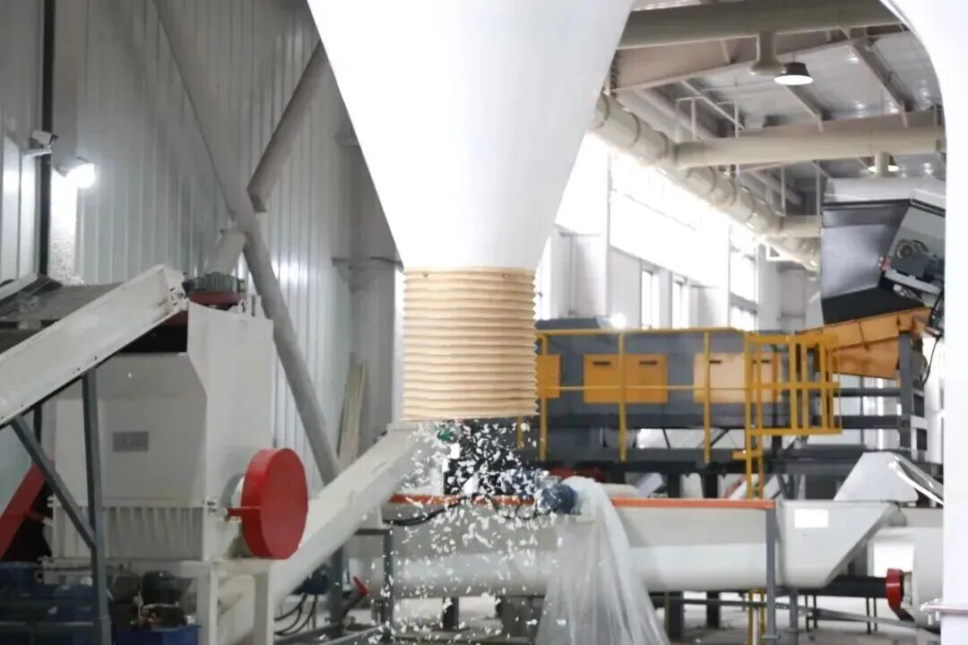 该公司位于城发环境(许昌)循环经济产业园,专注于PCR、PIR再生塑料高值化利用。车间内,废旧塑料经分拣、破碎、清洗、全自动分选等工序,转化为类似“面粉”的再生瓶片,用于管材、填充物、服装原料等制品。