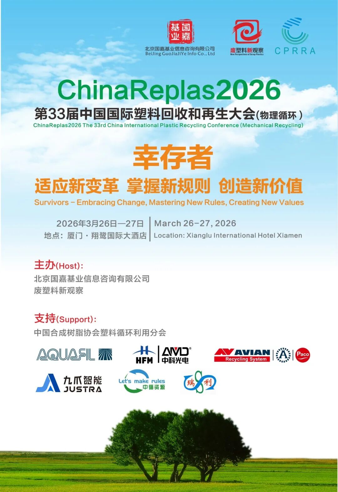 ChinaRePlas2026 第33届中国国际塑料物理回收和再生大会,将于2026年3月26日-27日在福建·厦门举办。本届大会以“幸存者-适应新变革、掌握新规则、创造新价值”为主题,汇聚全球行业专家、企业代表与政策制定者,共同探讨物理循环从技术突破到规模化商业落地的可行路径。