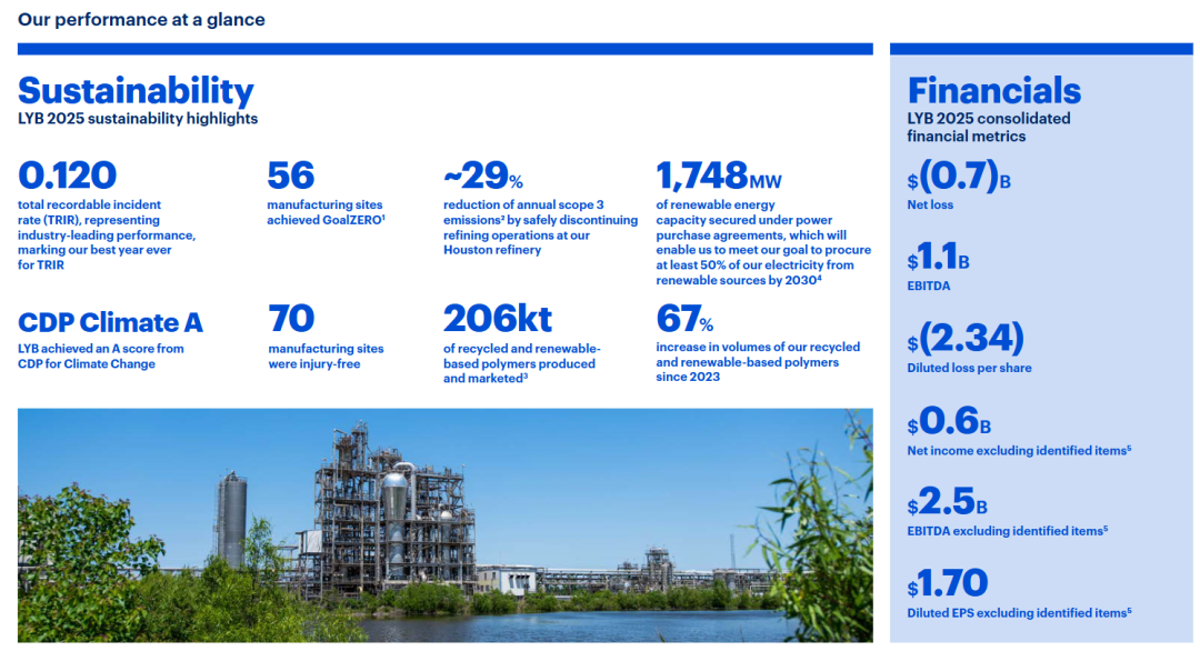 面对2025年销售额下降10%(至301亿美元)及出现净亏损的财务压力,LYB对其可持续发展战略进行了“刷新”。首席可持续发展官Andrea Brown指出,新的框架旨在更清晰地展示可持续性如何驱动商业价值。
