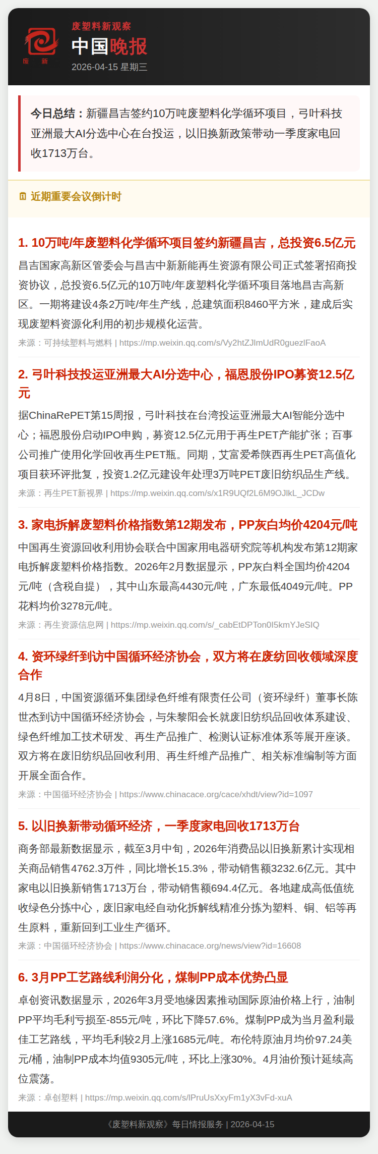 4月15日废塑料新观察晚报