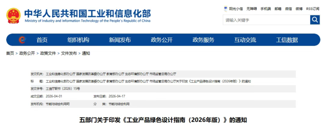 1. 五部门印发《工业产品绿色设计指南(2026年版)》