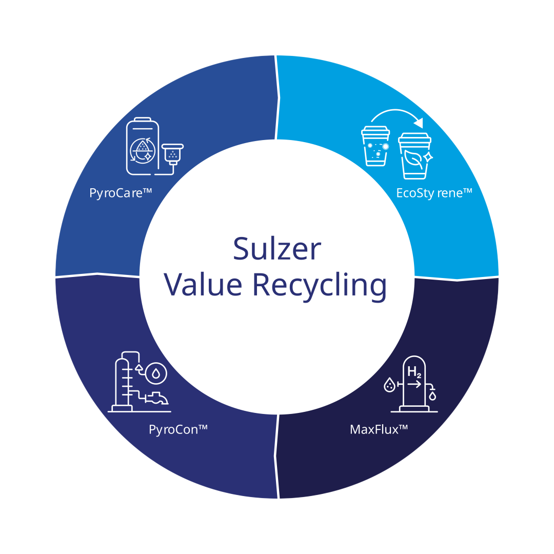 苏尔寿化工依托在分离、纯化及加氢升级领域数十年的深厚积淀,正式推出Value Recycling技术组合,涵盖 PyroCon™、PyroCare™、MaxFlux™、EcoStyrene™四大核心技术,直击化学回收各环节痛点,帮助客户将复杂、多变、高风险的废塑料原料,转化为可融资、可运营、可规模化的工业资产。