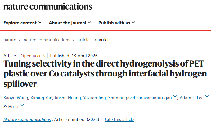 4月13日,Nature Communications在线发表了贵州大学李虎团队的题为“Tuning selectivity in the direct hydrogenolysis of PET plastic over Co catalysts through interfacial hydrogen spillover”(界面氢溢流策略调控钴催化剂直接氢解PET塑料的选择性)的研究论文。