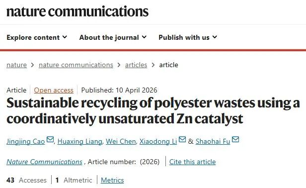 4月10日,相关论文以“Sustainable recycling of polyester wastes using a coordinatively unsaturated Zn catalyst”为题,发表在Nature Communications上。