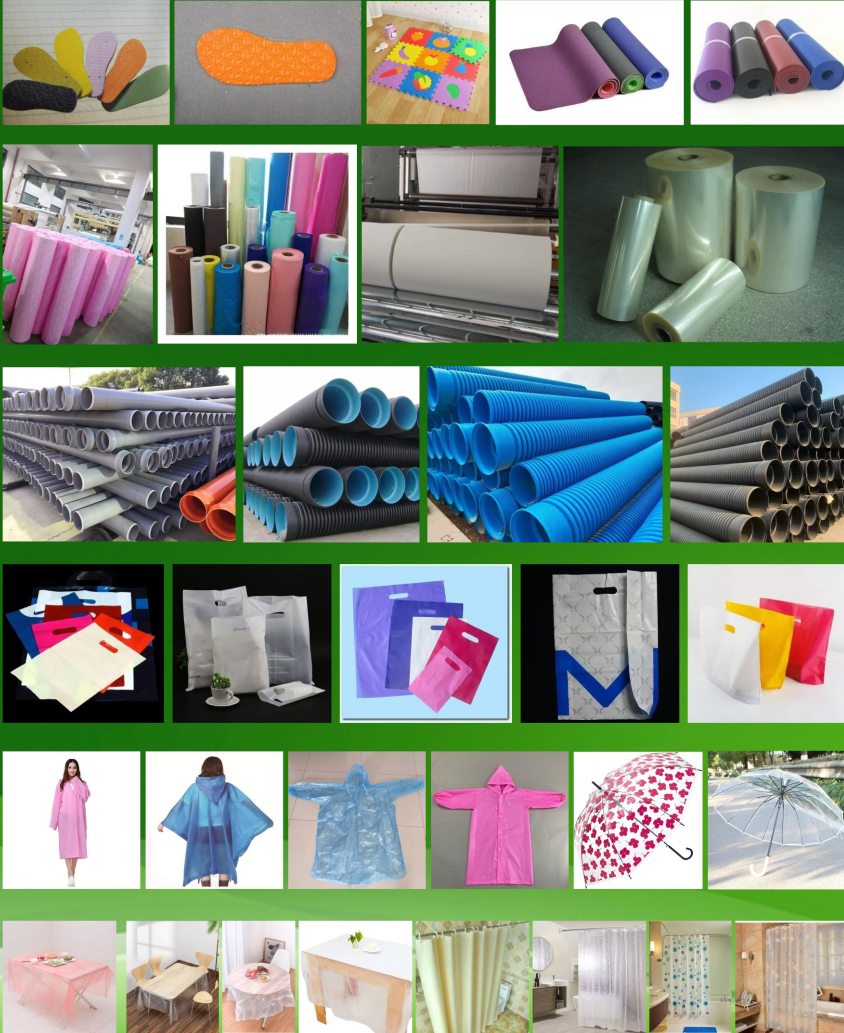 胶粒产品适用于发泡鞋材、吹膜、吹管道,改性、注塑片材及流延产品。PE、CPE、PEVA塑料环保薄膜适用于:服装包装袋、礼品袋、手挽袋、雨衣、雨伞、台布、浴帘布等。