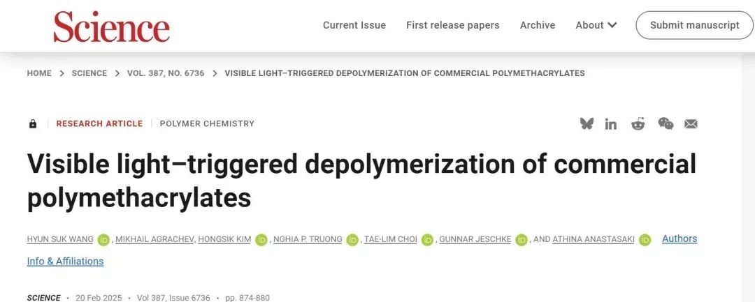 瑞士苏黎世联邦理工学院(ETH)Athina Anastasaki教授团队报道了一种主链引发、可见光触发的解聚,可直接应用于含有未公开杂质(例如共聚单体、添加剂或染料)的商业聚合物。2025年2月20日,相关研究以题为“ Visible light–triggered depolymerization of commercial polymethacrylates”的论文发表在顶级学术期刊Science上。