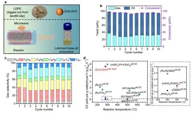中国科学院理化技术研究所副研究员马望京团队联合英国牛津大学研究员肖天存、清华大学教授唐军旺等人通过催化剂设计、微波能量利用及反应机制的创新,解决了塑料回收中能耗高、产物附加值低、杂质耐受性差等关键问题,为混合塑料废弃物的高效资源化提供了突破性方案。研究成果以Highly selective upcycling of plastic mixture waste by microwave-assisted catalysis over Zn/b-ZnO为题发表于Nat.Commun.。
