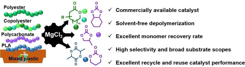 张越涛教授课题组开发了一种基于氯化镁(MgCl2)的催化体系。这种催化剂价格低廉、易于获取,却展现出了非凡的性能。在温和的无溶剂条件下,它能够高效地解聚多种聚酯材料,将其分解为原始单体,实现真正的闭环回收。该催化剂适用于包括聚酯和聚碳酸酯在内的11种塑料,单体回收率超过90%。例如,聚己内酯(PCL)和三亚甲基碳酸酯(PTMC)等常见塑料都可以在低于其Tc温度的条件下高效解聚。在PET、PS等商品塑料的复杂混合物中,MgCl₂催化剂能够精准分解目标聚酯,而不受其他塑料的干扰。此外,该体系首次被成功应用于随机共聚酯的回收,展现了其独特的适用性。