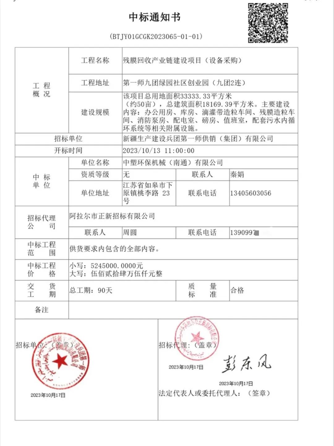 中塑在全国农业大省(主要西北地区)推广农地残膜清洁回收、循环再生项目的建设验收及业绩资料如下:(仅供参考)