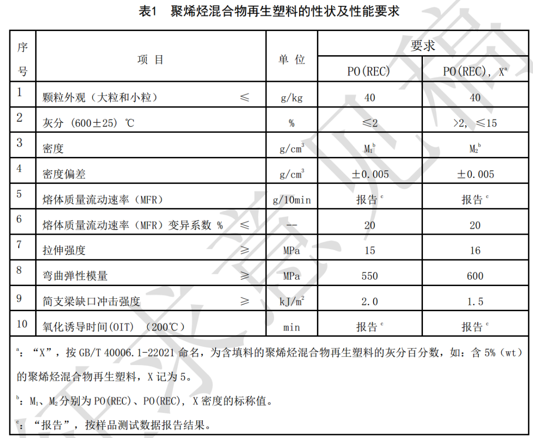 聚烯烃混合物再生塑料的性状及性能要求应符合表1的规定。