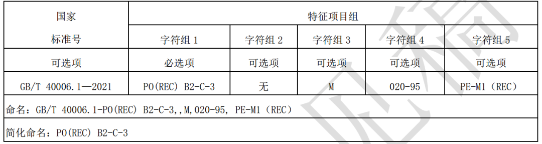 聚烯烃混合物再生塑料的命名和分类按GB/T40006.1—2021的规定进行。聚烯烃混合物再生塑料的特征性能为熔体质量流动速率(MFR)和密度,其字符代号规定见GB/T39360.1—2020的3.5.2和3.5.3。聚烯烃混合物再生塑料的聚丙烯(PP)和聚乙烯(PE)比例可在GB/T40006.1—2021中4.1命名字符组5附加信息中给出,其字母代码应符合GB/T39690.1—2020的3.2规定。