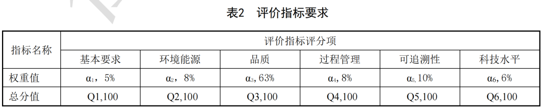 评价指标由一级指标和二级指标构成,一级指标包括环境能源要求、品质评价要求、过程管理要求、可追溯评价要求、科技水平评价,二级指标是与一级指标相对应的可量化或定性描述的具体指标,指标基准值及判定方式见表1。