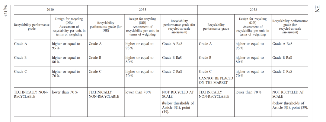 从2030年1月1日起,所有包装必须符合可回收再生设计(Design for Recycling)标准,只有达到A、B或C等级的包装(回收率至少为70%)才允许在市场上销售。