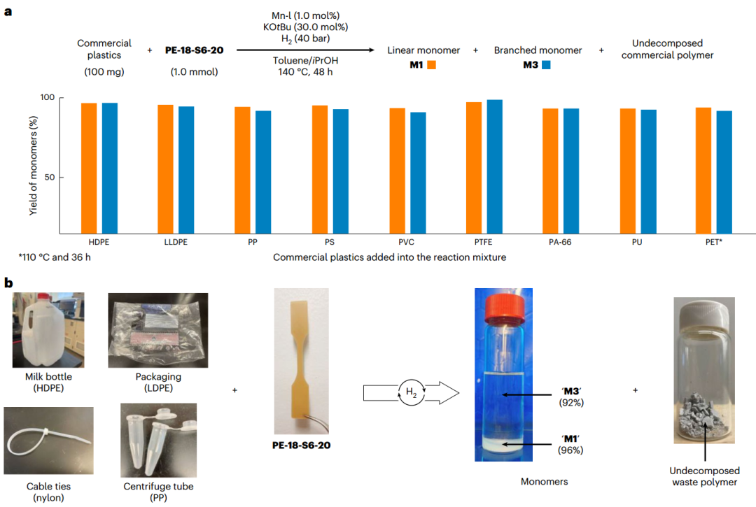 在温和氢气氛围(140°C, 40 bar)下,催化剂Mn-I可将聚合物完全转化为起始二醇单体,回收率>95%,即使在混合塑料废弃物中也能实现高选择性回收。