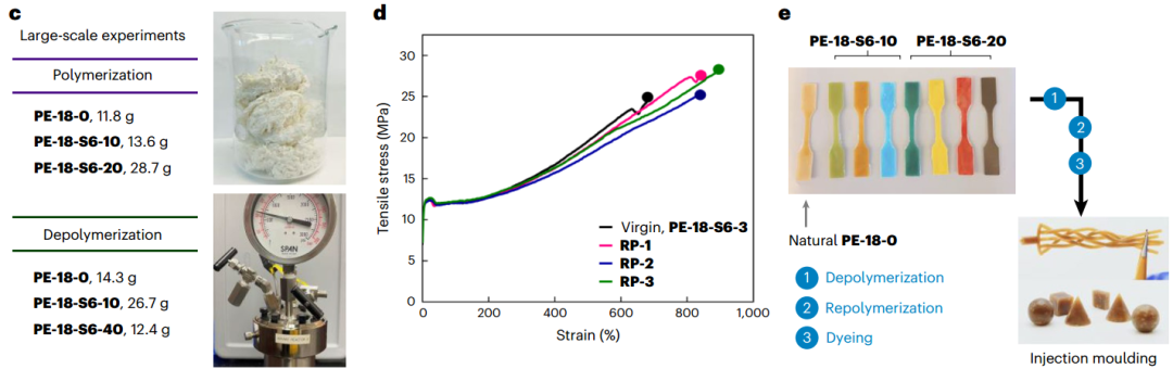 在200°C以下实现高效脱氢聚合; 材料具有高度可调的力学性能,从热塑型到弹性体均可覆盖; 可在存在市售染料、添加剂、商用塑料杂质等条件下实现>95%的闭环化学回收; 可通过注塑加工实现材料形态和用途的多样性。
