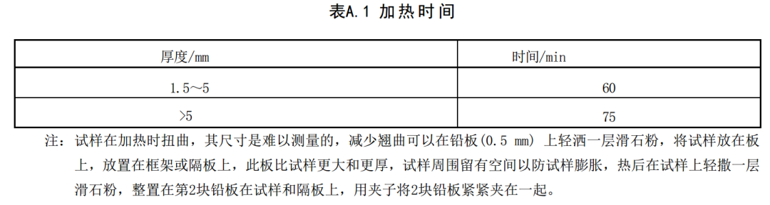 将试样水平放置在烘箱内架子上的平板上,烘箱温度保持160℃士2℃。采取合适的措施,防止试样粘在平板上,如在平板上覆盖一层滑石粉。加热时间取决于板材的厚度,应按表A.1 所示。