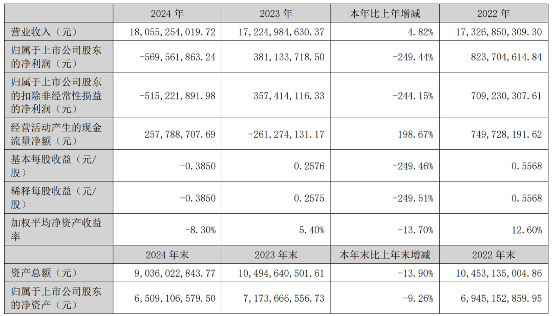 归属于上市公司股东的扣除非经常性损益的净利润为-5.15亿元,而2023年为3.57亿元,同比下降244.15%。这表明公司核心业务的盈利能力受到严重冲击,经营状况面临较大压力。