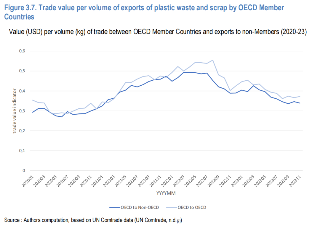 质量差异:OECD国家间贸易的塑料废物单位价值(美元/千克)高于对非OECD国家的出口(图3.7)。尽管2021–2022年全球树脂与大宗商品价格上涨使价值指标普遍提升,但这一内外差距暗示,向经合组织国家输送的废料平均质量或更高,而输往非经合组织国家的废料质量相对偏低。