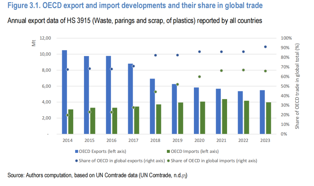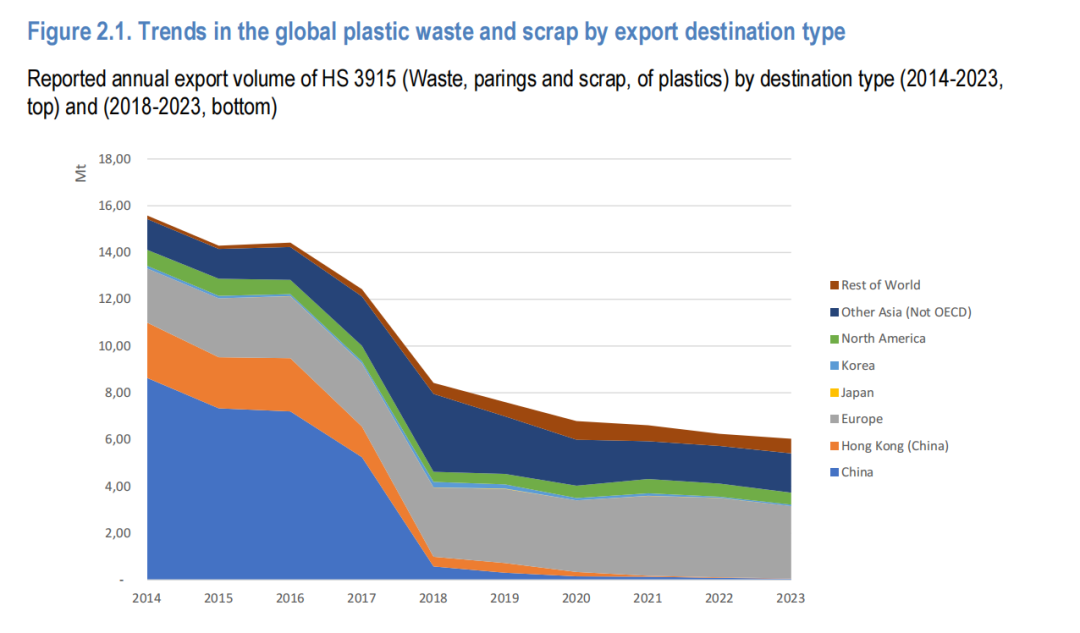 报告指出,2014年至2023年期间,全球塑料废物和废品贸易量近乎腰斩,这一变化与2018年中国实施“国门利剑”政策密切相关,该政策大幅收紧了废旧塑料进口限制,直接导致当年贸易量骤降。