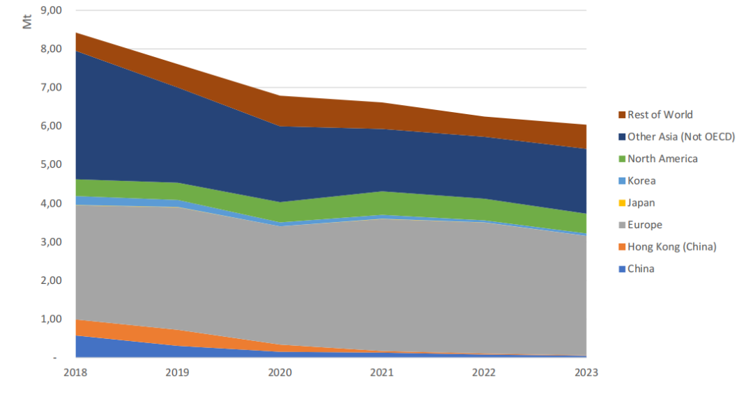 2023年全球塑料废物贸易量较2022年下降3.4%,延续了长期下行趋势(图2.1)。中国曾是全球最大进口国,2017年进口量达940万吨,但2018年政策收紧后骤降至约100万吨。此后,东南亚国家成为主要替代目的地,但马来西亚、越南等国随后也出台进口限制,进一步压缩了全球贸易空间。值得注意的是,区域内部贸易的重要性显著上升。