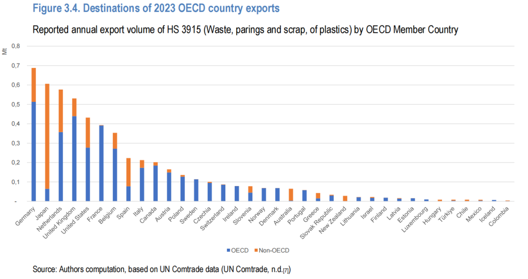 关键出口目的地:2023年,马来西亚(61万吨)、越南(27万吨)和印度尼西亚(27万吨)位列全球前五大进口国。日本是主要出口国,其90%的塑料废物流向非OECD国家,其中马来西亚占其出口量的33%(图3.4)。