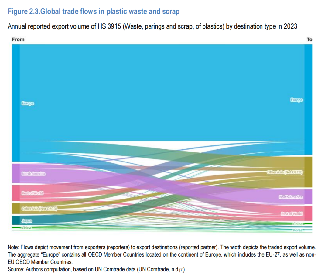 2023年,欧洲OECD成员国之间的贸易占全球总量的近一半,北美地区的美国和加拿大双边贸易也占据重要份额(图2.3)。这一现象表明,区域贸易协定和共同监管框架对塑料废物流动的影响日益增强。