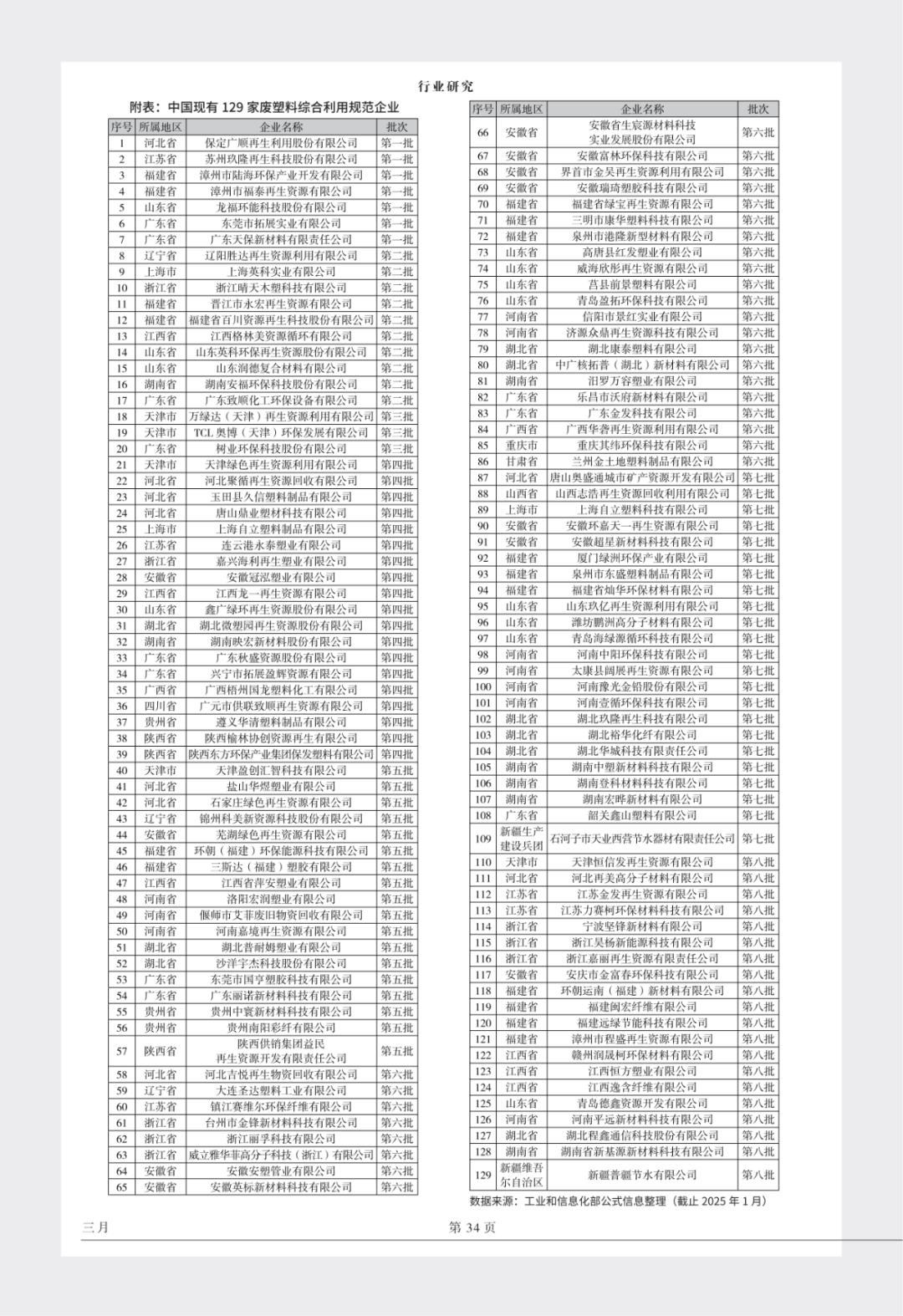 为贯彻落实《循环经济促进法》,规范废塑料资源综合利用行业发展秩序,提高资源综合利用技术和管理水平,引导行业健康持续发展,2015年底,工业和信息化部制定了《废塑料综合利用行业规范条件》、《废塑料综合利用行业规范条件公告管理暂行办法》,并组织开展废塑料综合利用规范企业评审工作。截至2024年底,已公告8批次129家符合废塑料规范条件企业名单,合计废塑料年综合利用产能超过900万吨,占社会废塑料资源量约45%。通过整理历年新增及撤销废塑料综合利用规范企业名单,中国现有废塑料综合利用规范企业名单及区域见附表。