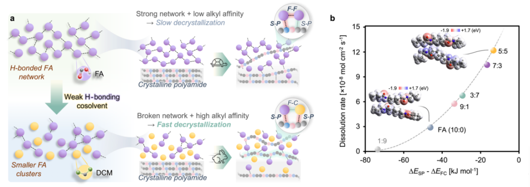 图4. (a)共溶剂增强的聚酰胺溶解动力学的拟议机制的图示:弱氢键溶剂破坏了强FA网络,增加了溶剂-聚合物相互作用,加速了脱羧过程。在纯FA中,溶剂-溶剂相互作用(FF)和溶剂-酰胺相互作用(SP)较强,而溶剂-亚甲基相互作用(SP)较弱,相比之下,DCM调节H-键合的溶剂网络以减弱溶剂-溶剂相互作用(FC),而在酰胺和亚甲基位点处的SP都是强的;(b)观察到的溶解速率(每单位表面积每单位时间PA链的摩尔数)与溶剂-聚合物相互作用(溶剂化能)和溶剂-共溶剂相互作用之间的差之间的连续关系