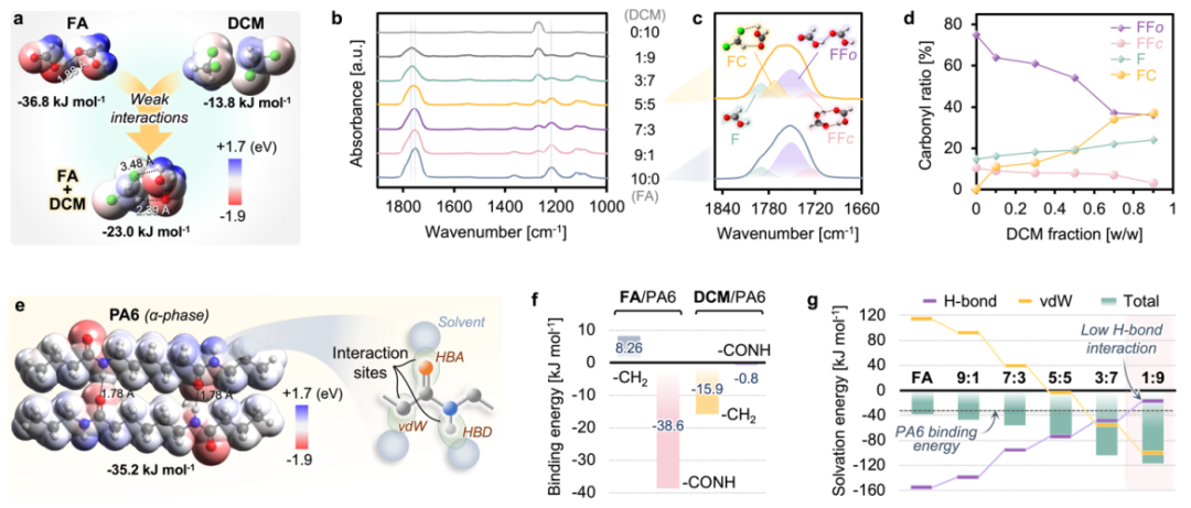 图3. (a)FA(FF)、DCM(CC)和FA/DCM(FC)二聚体的分子静电势(MEP)、结合能(kJ/mol)和H-键长(OJ);(b)FA与不同助溶剂级分(fDCM)的FTIR光谱,以及(c)FA的开放(FFo)和封闭(FFc)以及单体(F)形式的放大羰基区域(具有去卷积峰),(d)对于不同的共溶剂级分,代表(c)中所示的每种相互作用的羰基谱带的积分面积的变化;(e)代表a相晶体和溶剂相互作用位点示意图的氢键PA6低聚物的结构和MEP;(f)FA和DCM在每个结合位点的近似结合能;(g)总溶剂化能DGsolv和近似氢键和vdW分量