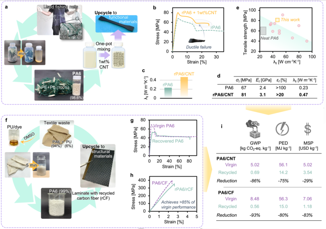 图7.(a)功能复合材料的快速、RT溶解/分离和制造:将暴露于人工海水中3个月的渔网在室温下在共溶剂体系中快速溶解并分离以回收PA6、PE和Pb,然后通过一锅法溶液混合和注射成型分散碳纳米管(CNT)以制造rPA6/CNT试样;(b)拉伸行为和(c)回收/升级循环的PA6的热导率;(d)回收/升级循环的PA6材料的性能总结;(e)rPA6/CNT的多功能性能(在强度和导热性方面)与类似报道的复合材料相比(f)结构复合材料的快速、RT溶解/分离和制造:含PA6和聚氨酯的废旧纺织品(与染料一起被DMSO沿着除去)在室温下迅速溶解在共溶剂体系中并沉淀以回收PA6,然后使用共溶剂体系与预先回收的编织碳纤维(rCF)层压;碳纤维层压板和碳纳米管纳米复合材料的碳足迹和经济分析:(一)全球升温潜能值,(j)PED,和(k)MSP