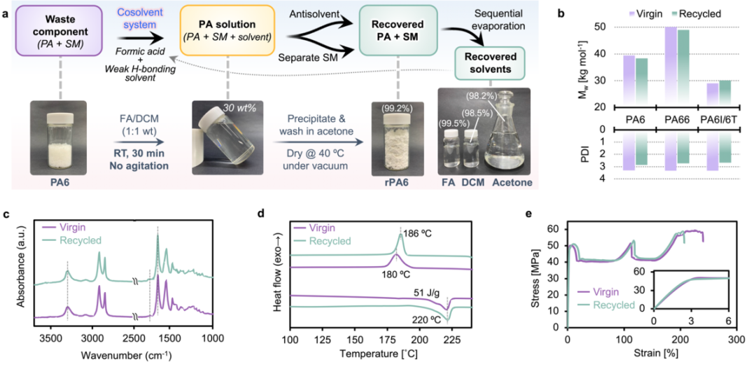 图5. (a)基于溶解的再循环方案示意图,附有具体示例条件下的照片。在不需要搅拌的情况下,在室温下将两种或更多种第二材料(具有或不具有第二材料,SM)溶解在共溶剂体系中,产生PA溶液,其可以在沉淀、洗涤和干燥之前分离成SM和PA。共溶剂和反溶剂允许它们通过顺序蒸发完全回收;(b)在一个溶解/再生循环之前和之后,PA6、PA66和PPA(PA6I/6T)的分子量(Mw)和多分散指数(PDI);(c)原始和再生(纯)PA 6的FTIR光谱,(d)DSC扫描,和(e)拉伸应力-应变曲线