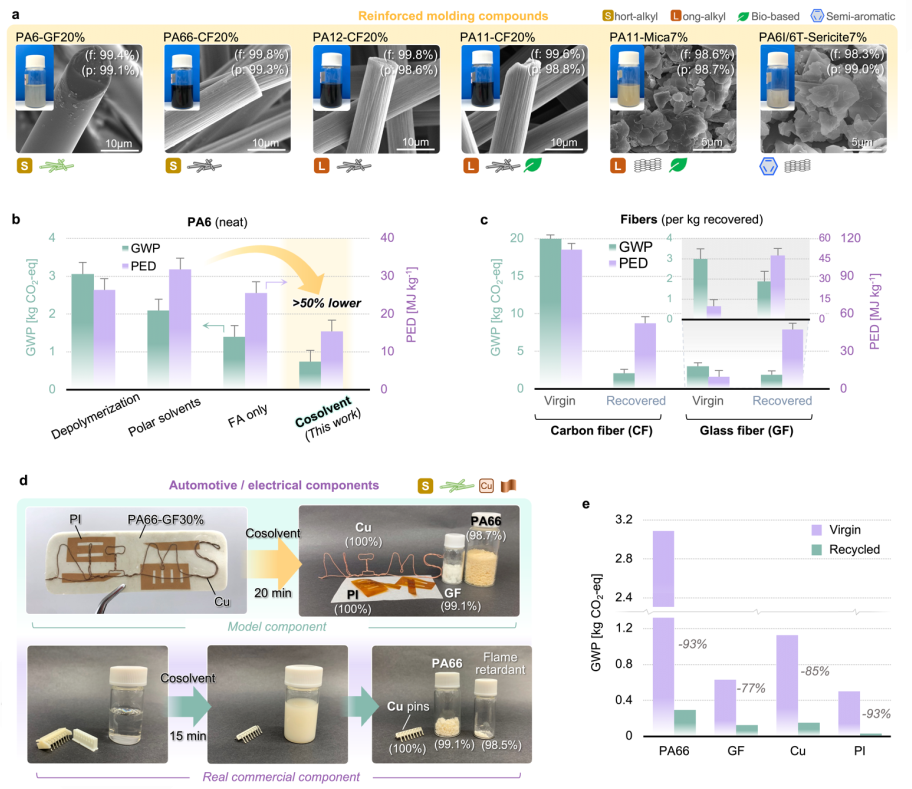 图6. (a)各种PA基模塑料的RT溶解:PA6、PA66、PA11、PA12、PA6I/6T、碳纤维(CF)、玻璃纤维(GF)、纳米粘土(云母、绢云母);符号表示复合物的种类,插图是溶液的照片(b)由全球变暖潜能值度量描述的碳足迹,(全球升温潜能值,千克CO2当量/千克材料)和一次能源需求不同回收方法的纯PA6(PED,兆焦耳/公斤材料)(c)从PA基复合材料中回收的碳纤维和玻璃纤维的全球升温潜能值和压力释放值;插图是(b)中GF误差条的放大图,(c)如果溶剂回收效率降低,则代表保守值;(d)将基于共溶剂的溶解方法应用于实际的汽车和电气部件:在原始状态下,从模型和真实的成分中有效地回收了通常与PA一起使用的SM(玻璃纤维、铜、PI、阻燃剂)