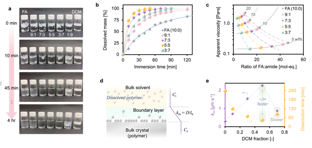 图2. (a)照片和(B)室温下溶解的PA 6粒料的质量变化测量(无搅拌);(c)具有不同固体浓度和共溶剂分数的PA 6溶液的表观粘度;(d)晶体溶解期间固-液界面的示意图,其中km是根据Noyes-Whitney模型的跨越边界层(厚度lb)的传质的量度;(e)共溶剂分数对传质系数km和总溶解时间的影响