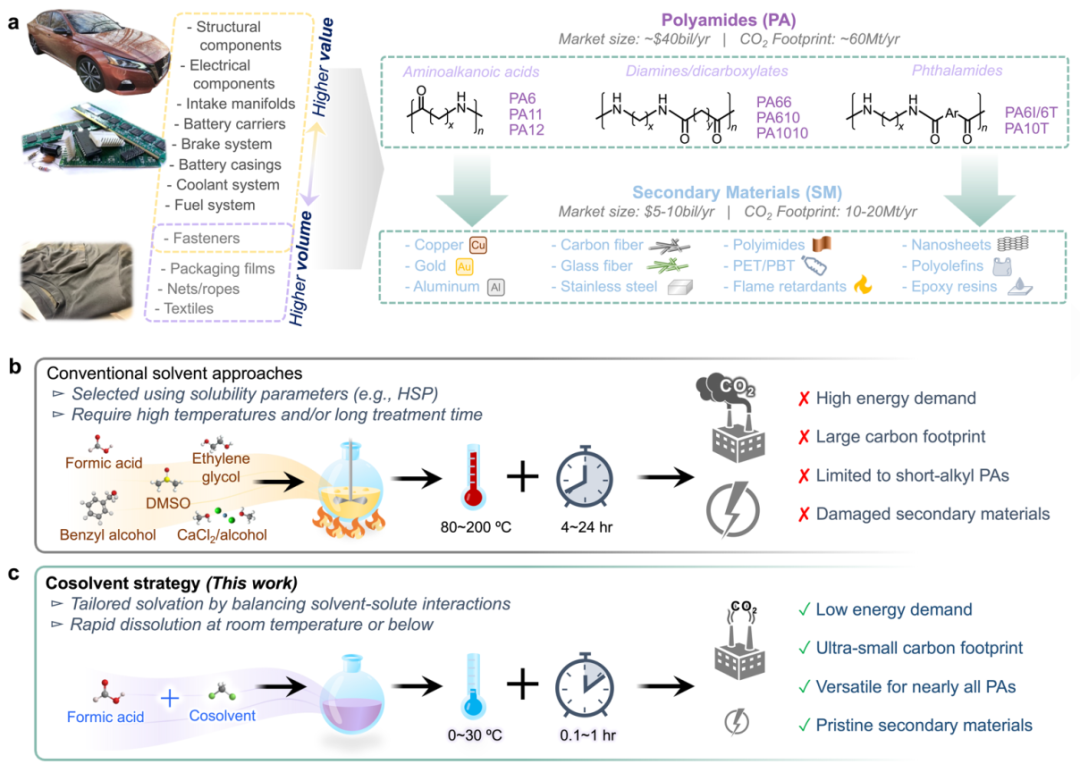该研究首次提出以“弱氢键调控共溶剂”实现常温快速溶解尼龙的新策略,彻底打破了以往“高温溶解”的技术瓶颈。不仅溶解速度提高10倍以上,还大幅降低能耗和碳排,兼顾了效率、环保与经济性。与昂贵、毒性大的氟化溶剂相比,甲酸+二氯甲烷体系成本更低、操作更安全、环境适应性更强。更重要的是,该策略具有极强的通用性,适配多种尼龙和填充材料,在面对复杂混合废料时也可“有的放矢”地精准分离。这为整个废塑料回收行业提供了一种可规模化推广的新思路。随着未来绿色溶剂的加入(如生物基溶剂),这种“智能共溶剂溶解”方案有望应用到更多高值塑料的回收上,成为实现碳中和目标的重要技术抓手。