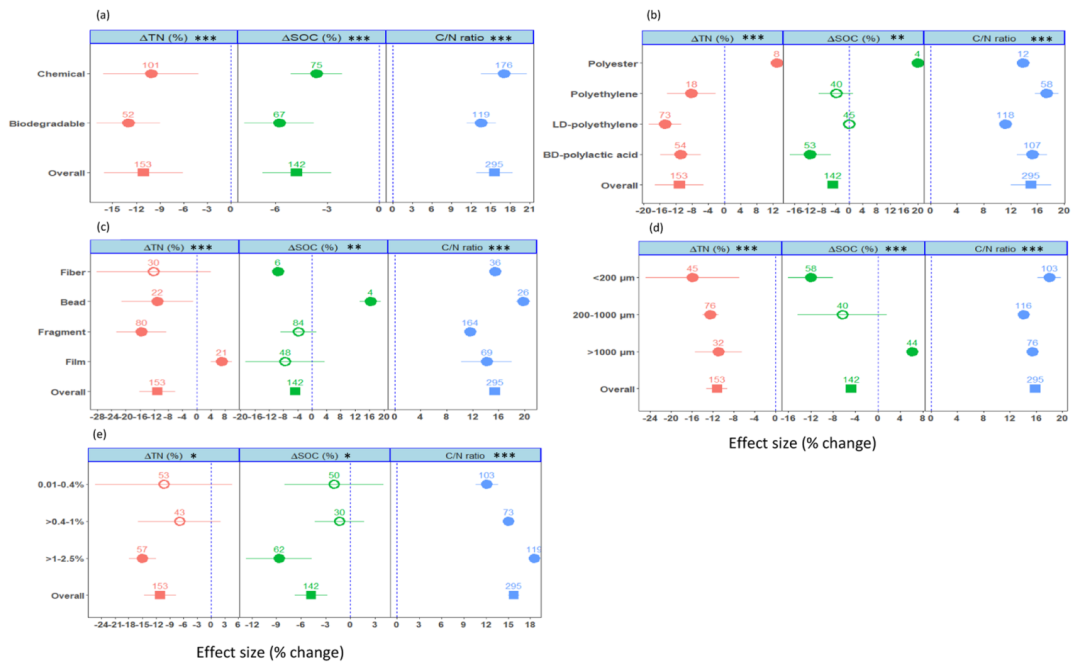 昆明植物研究所山地中心与英国班戈大学、德国哥廷根大学合作进行的一项全球数据分析,基于400个实地观测点,揭示了不同类型、尺寸和含量的微塑料,正在显著降低土壤中的碳氮含量。此外,降水、温度等气候因子被发现会进一步加剧这一影响。