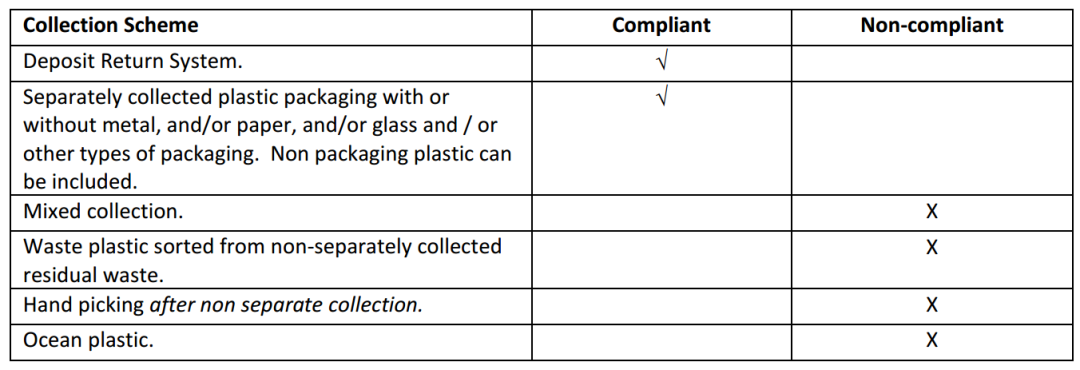 可接受的收集体系:必须是与其他塑料、纸、金属或玻璃共同、独立于其他残余垃圾分流回收的系统,严禁包含危险废弃物。